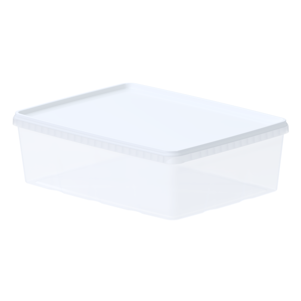 Rektangulær 2,9 L emballage med pilfingersikring i fødevaregodkendt materiale. Emballagen kan anvendes med et tætsluttende låg, og den er ideel til slikproducenter samt velegnet til opbevaring af flødeboller, kiks og andre delikatesseprodukter m.m. Låg bestilles separat.