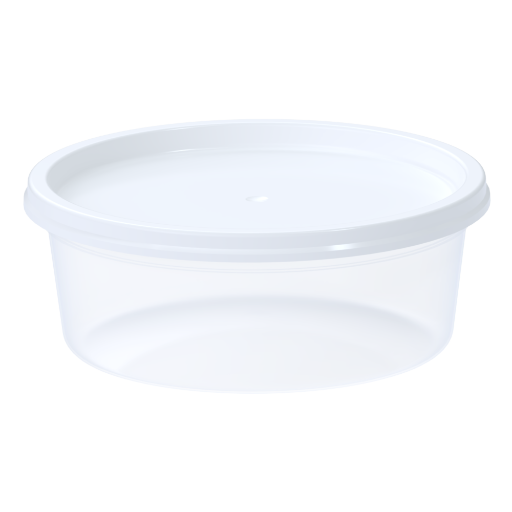 Rund emballage, der kan anvendes med et tætsluttende låg. Velegnet til dressinger, saucer og delikatesseprodukter. Låg bestilles separat.