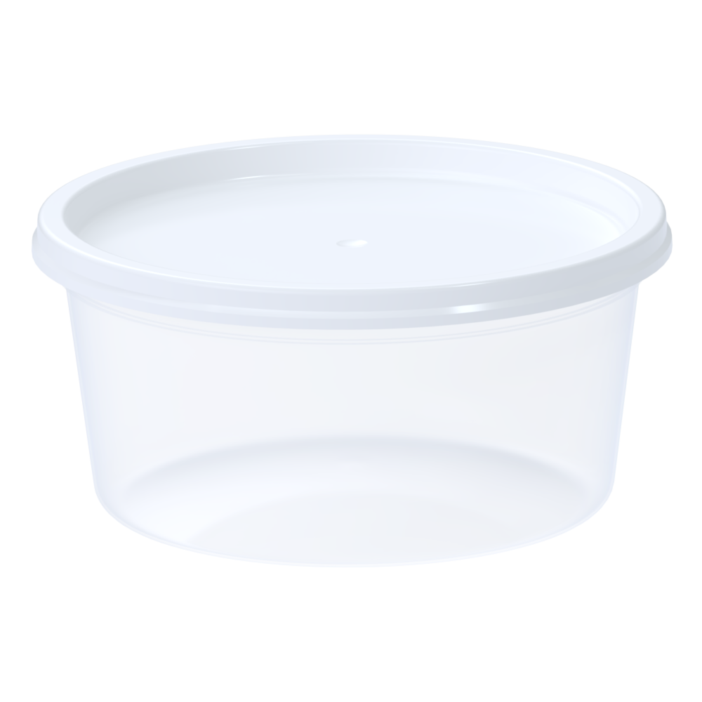 Rund emballage, der kan anvendes med et tætsluttende låg. Velegnet til dressinger, saucer og delikatesseprodukter. Låg bestilles separat.